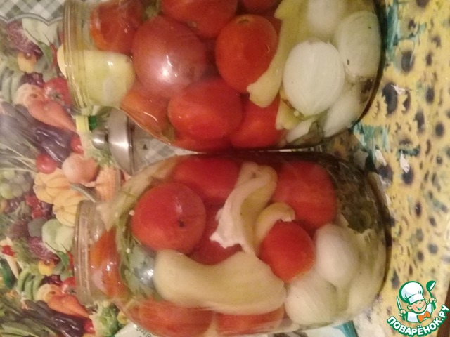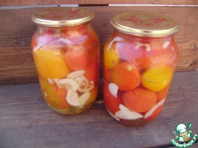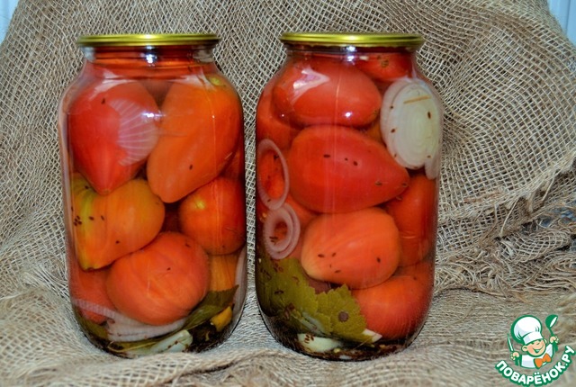 На дно банки положить порезанный колечками лук (количество по желанию). Затем укладывать помидоры. Залить не сильно горячим раствором и не забыть положить в банку специи из раствора. Стерилизовать 15 мин. Закатать и опрокинуть.