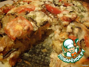 Любителям овощей посвящается!!! Для мясоедов есть утешительный приз - слой фарша. Без мяса тарт вполне можно использовать как основное блюдо - очень сытно, питательно получается. А с мясом моим мужчинам жить веселее!