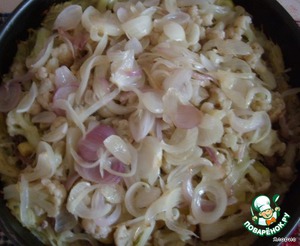 Поверх сыра выкладываем отварную цветную капусту, на нее - обжаренный до мягкости лук.