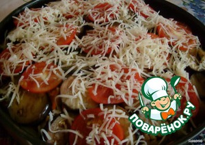 На баклажаны кладем кружки помидорчиков, посыпаем оставшимся сыром.