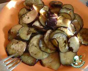 Нарезанные тонкими кружками баклажаны смешиваем с солью и оставляем настояться около получаса - для удаления горечи. Промываем холодной водой, обсушиваем салфеткой и обжариваем на растительном масле. Выкладываем на салфетку - удаляем лишний жир.