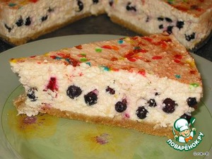 Торт получился легкий, воздушный, не приторный, даже с кислинкой, как я и люблю. Ягоды или фрукты лучше брать сладкие, в оригинале здесь использовалась клубника. Творог лучше протереть, чтобы он был кремообразный, я этого не сделала из-за нехватки времени, получилось вкусно, но было бы лучше, если бы все-таки протерла. Рецепт из журнала Лиза "Приятного аппетита" + мои изменения.