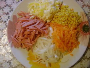 Лук, морковь, колбасу и яйца нарезать соломкой