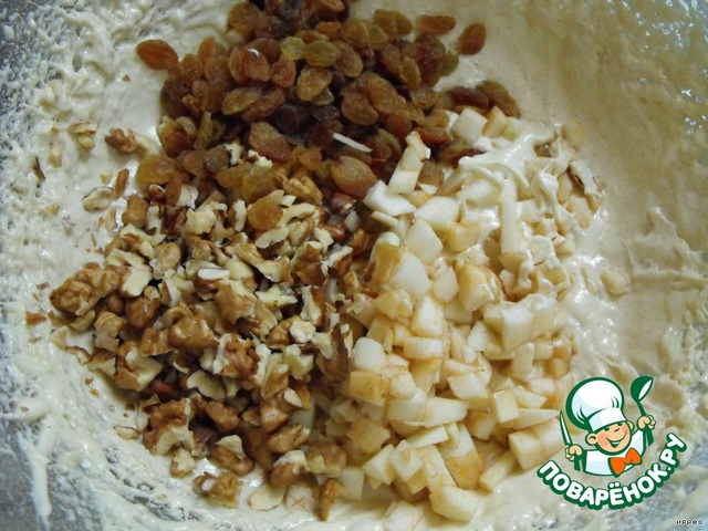 В тесто добавляем яблоки, орехи, изюм -