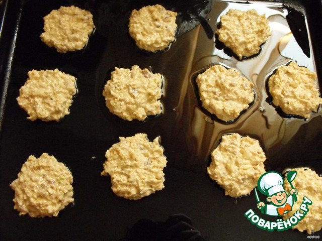 На противень ложкой выкладываем небольшого размера печеньки и выпекаем в духовке при температуре 200 градусов примерно 15 минут.