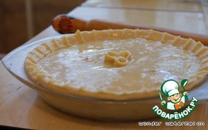 Оставшееся тесто раскатать, укрыть им пирог, плотно скрепив нижний слой теста с верхним, и помазать яйцом. Можно еще украсить, но особо не заморачиваться: мелкие детали расплываются: