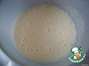 Бисквитное тесто: яйца взбить с пудрой, добавить муку, перемешать.