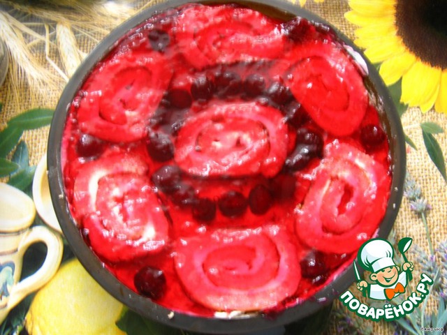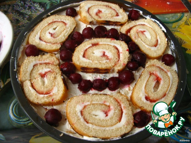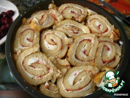 Последний слой - рулеты. Между кусочками рулетов уложить ягоды.