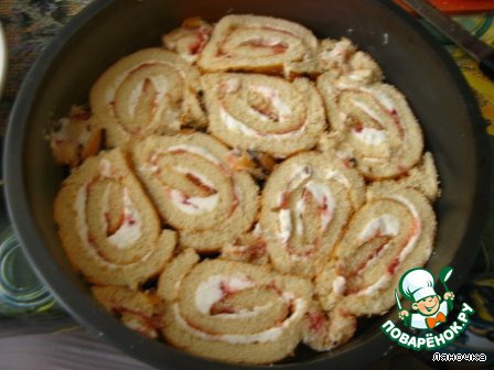В форму (разъемную) выложить слой из кусочков рулета. -