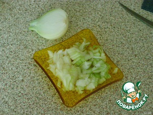 Лук мелко нарезать, сбрызнуть уксусом и оставить мариноваться.