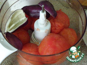 Очищенные помидоры и сладкий перец измельчить в блендере (или другом приспособлении). Затем добавить хлеб с чесноком и маслом и еще раз измельчить.