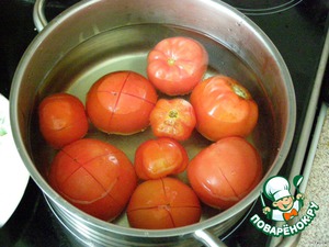 Помидоры надрезать крестообразно и подержать в кипятке 1 минуту. Затем снять кожицу.
