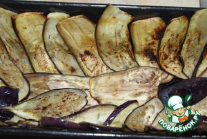 Баклажаны, нарезаем вдоль. Солим, оставляем минут на 5. Потом смазываем растительным маслом (слегка, при помощи кисточки). -
