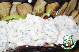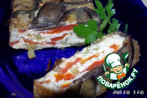 Далее повторяем всё, пока не кончатся продукты (у меня получилось два слоя). Если баклажаны остались, укладываем их сверху. У меня не осталось, потому я просто завернула нижние.