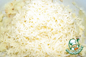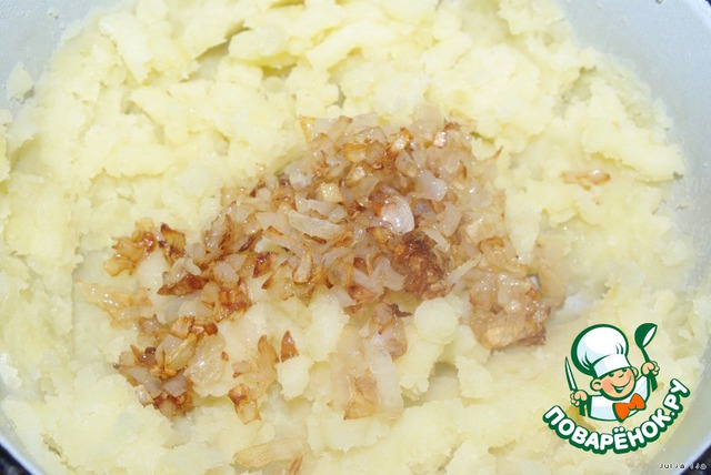 С картошки сливаем жидкость и делаем пюре. Миксером здесь лучше не пользоваться, а воспользоваться старым бабушкиным способом, то есть толкушкой. Добавляем лук.