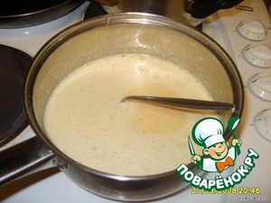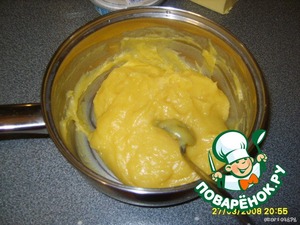 Заварить крем на среднем, а потом на маленьком огне, постоянно помешивая, пока масса не загустеет. -