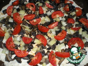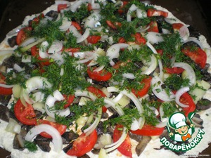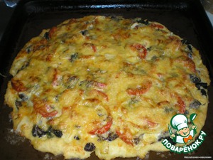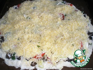 смазать майонезом и посыпать тертым сыром, и выпекать в духовке при температуре 200 градусов минут 30