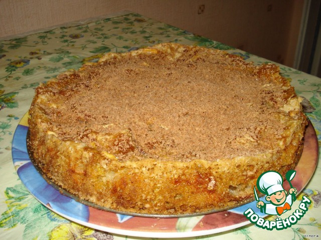 • Духовку разогреть до температуры 220 градусов, поставить пирог, при этом сделать огонь в духовке поменьше и выпекать до готовности (у меня выпекалось около часа). Готовность проверьте деревянной палочкой, чтоб тесто не прилипало к ней. Дать немного остыть пирогу и посыпать сверху тертым шоколадом.