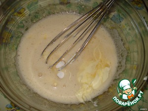 • Форму внутри смазать маргарином или сливочным маслом и немного сверху присыпать мукой. На дно формы положить две полных столовых ложки теста и разложить его так, чтоб покрыть дно.
