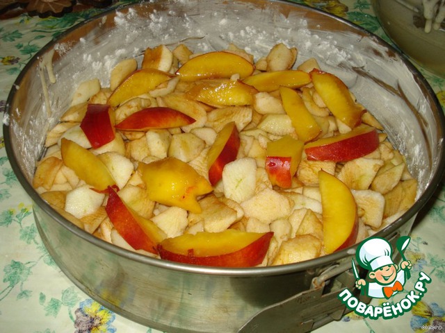 • Выложить сначала на тесто яблоки, затем нектарин (либо другие любимые фрукты) и сверху посыпать смесью ванильного сахара. Покрыть все фрукты остатком теста.