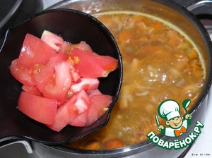 Томат обдаем кипятком и снимаем кожицу, режем и отправляем в бульон