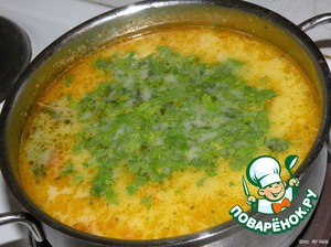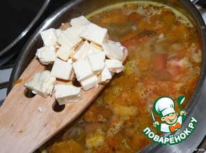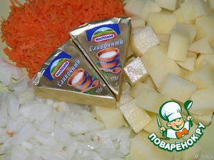 Плавленый сырок режем на части и добавляем туда же... *YES* Помешиваем пока он не растворится.