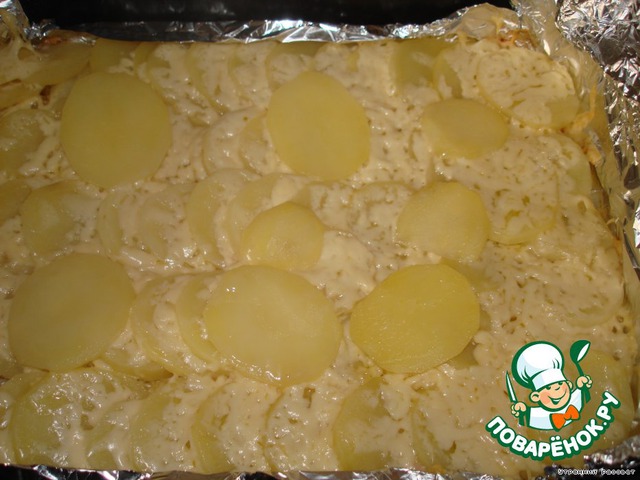 Картошку моем,чистим,режем кружочками и укладываем в форму(устланную фольгой) в нахлест(лесенкой).Далее, трем на крупной терке масло и сыр,можно прямо сразу на картошку(я смешала и выложила)