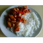 Подготовить куриную грудку (очистить от кожи, вырезать кость, порезать на кусочки). Сложить в миску, обильно посыпать карри и паприкой, перемешать.
