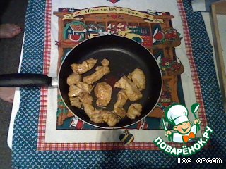 Разогреть сковородку, налить растительное масло. В нем быстро обжарить кусочки курицы до золотистой корочки.