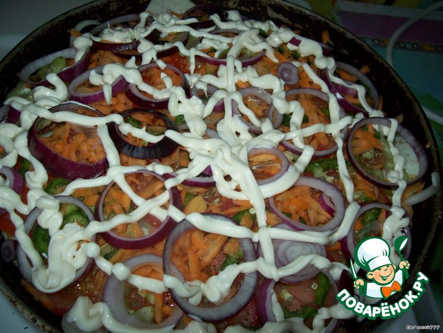 Наливаем немного масла подсолнечного на сковороду, и укладываем первый слой, сначала кабачок затем помидоры, перец, лук и посыпаем тертой морковью, поливаем майонезом.