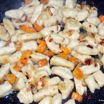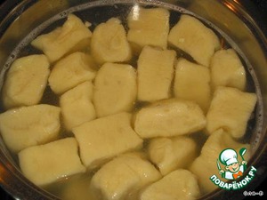 Добавить в протертый картофель яйцо, соль, муку. замесить тесто, при необходимости подсыпать еще муку, замесить мягкое тесто, сильно забивать не стоит, тесто должно быть мягкое и нежное на ощупь. Поделить тесто на 2 части, стол посыпать мукой, скатать тесто в "колбаску" и порезать на небольшие кусочки. -