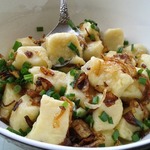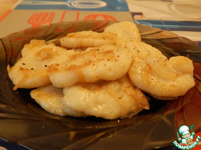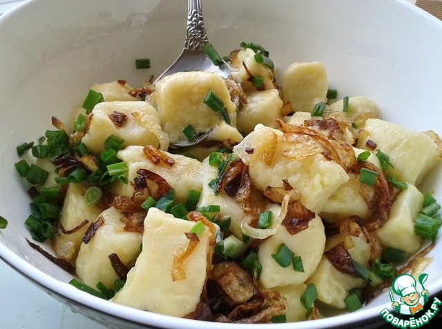 Вскипятить воду с солью и лавровым листом, опустить туда по одной наши клецки, помешать аккуратно ложкой, когда всплывут и вода закипит поварить еще минуту-две. Затем вынуть шумовкой, смешать в миске с обжаренным луком. Или полить поджаркой уже перед подачей на стол.