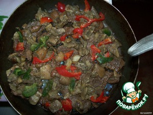 для начала нарезаем пластиками мясо, отбиваем его, солим, перчим и обжариваем с двух сторон на сковороде, затем грибы белые(можно любые)отвариваем или если есть отваренные также не долго обжариваем на сковороде.Потом укладываем на противень или на сковороду для духовки:сначала мясо,а на него грибы и резанный болгарский перец.(можно также добавить помидоры).