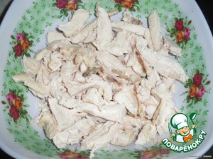 Отварить курицу (окорочок, грудку, филе), приготовить лук, морковь, приправу... При варке курицу не солить!