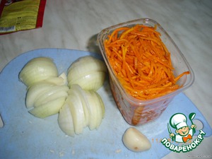 На филе лук, морковь, приправу, выдавить чеснок, вылить приправу, добавить бульон.