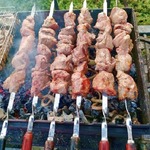 Нанизывать кусочки мяса на шампуры, чередуя с кружочками лука. Жарить на мангале с углями. Шашлык получается очень вкусным.