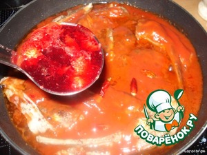 Заливаете протёртыми томатами (у меня ушла 1 в 250 мл пачка, а у вас, чтоб покрыло рёбрышки) и добавляете пару-тройку половничков жидкого (гы!) "недоваренного" сливового варенья (а в целом, люди, не парьтесь: возьмите сливы и протушите их с сахарком, делов-то!)... Тушим под крышкой до готовности - мясо должно быть мягким. Следите, чтоб соус загустел, но не подгорел... может легко случиться!