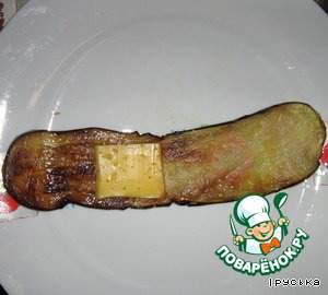 На каждый ломтик баклажана положить кусочек сыра.