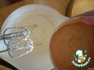Для начала займемся коржом. Взбиваем яйца с сахаром в воздушную пенку. Добавим туда «добрую» ложку сметаны. Затем разрыхлитель.