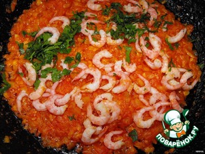 За несколько минут до готовности добавить в начинку зелень и креветки. -