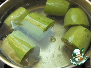 Разрезать кабачки среднего размера на 3 части поперек и ложкой удалить сердцевину немного не до конца – получатся “бочонки”.