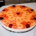 2 или 3 пачки творога растереть (в идеале блендером или миксером) с 1 стаканом сахара и со 100 г. сливочного масла. Залить тeплой водой 3 ст. л. желатина и дать набухнуть примерно пол часа. Размешать, поставить на огонь, но до кипения не доводить, остудить и влить в творог. Готовую массу осторожно выкладываем на бисквит поверх фруктов (прямо в форму, что бы края торта получились ровными). Верх пытаемся разровнять лопаточкой как можно лучше! Ставим всe в холодильник примерно на час.