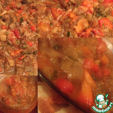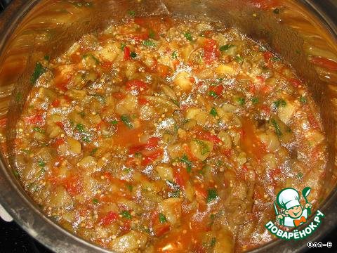 Помидоры разварить и размять толкушкой, добавить мелко порезанную зелень, чеснок через пресс, масло, соль, сахар, молотый перец, перемешать, кипятить минут 5. Затем к помидорам добавить измельченные баклажаны и перец, хорошо перемешать, кипятить смесь на умеренном огне 15 минут иногда помешивая -
