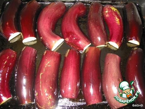 Все овощи включая очищенный чеснок и зелень вымыть, дать стечь воде. У перца срезать хвостики и разрезать его вдоль пополам, убрать семена и перегородки. Баклажаны так же разрезать вдоль пополам срезав кончики с двух сторон. Включить духовку на 220 градусов. Противень смазать маслом, уложить баклажаны срезом вниз в один ряд, смазать их растительным маслом при помощи кисточки, запекать пока они не станут мягкими (проверить спичкой)