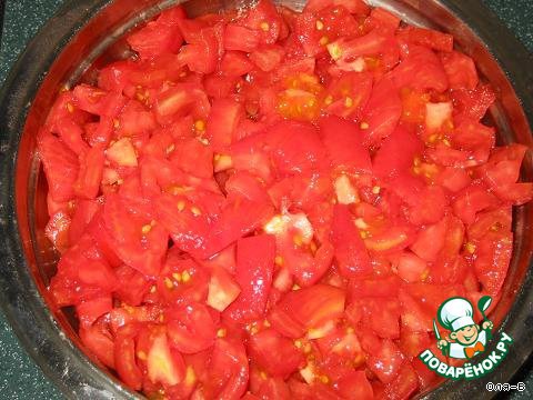 У помидоров сделать надрезы, обдать их кипятком и очистить от кожицы, затем порезать кубиками.