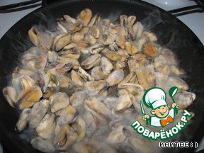 Когда лук подрумянился, всыпаем в сковороду мидии.
