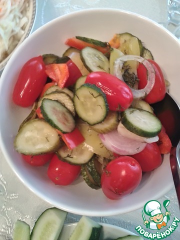 Огурцы промыть, порезать пополам, каждую половинку проткнуть вилкой 1 - 2 раза. Помидоры лучше брать небольшие, желательно "сливки". Каждый помидор также проткнуть вилкой 1 - 2 раза. Перец болгарский порезать крупными ломтиками, чеснок очистить и крупно порезать, зелень также порезать. Выложить в емкость (я обычно делаю в кастрюле на 4, 5 л) подготовленные огурцы, помидоры, перец, пересыпая слои зеленью, чесноком, добавить перец-горошек, несколько лавровых листиков). Вскипятить воду с солью и сахаром, добавить уксус. Кипящим рассолом залить овощи, закрыть крышкой. Поставить остывать (я обычно делаю на ночь), а когда полностью остынет - убрать в холодильник. На следующий день можно употреблять.
