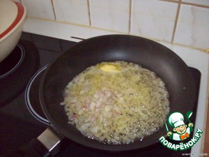Теперь почистим лук и чеснок и мелко порежем. По рецепту идeт пучок зелeного лука, но у меня не было-взяла лук-шалот две не большие луковички. В сковороде растопим 2 ложки сливочного масла и поджарим в нeм лук с чесноком до прозрачного состояния, не зажаривать сильно.