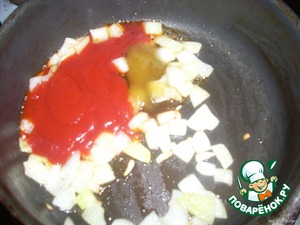 Дальше нужно обжарить лук,слегка, не ожидая золотистого цвета. Добавить туда томатный соус,мёд и перец чили по вкусу. С мёдом очень аккуратно. У меня томатный соус был сладкий, и я с медом слегка перестаралась,получилось через чур сладковато. Всё это обжаривается очень быстро в течении минуты-полторы.