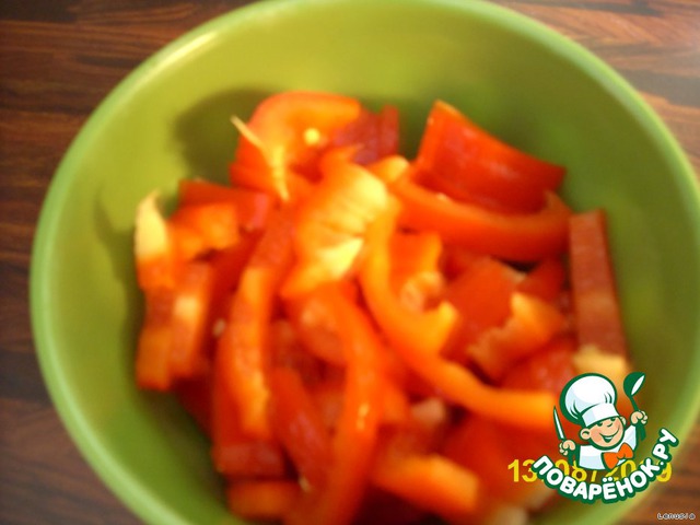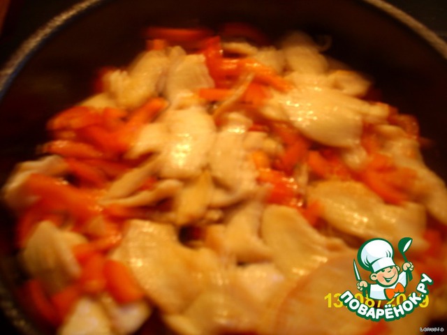 Мясо обжарить на подсолнечном масле. Добавить нарезанные паприку, лук и слегка обжарить. Добавить муку хорошо перемешав, затем соль, перец и сливки. Тушить в течение 10 минут.